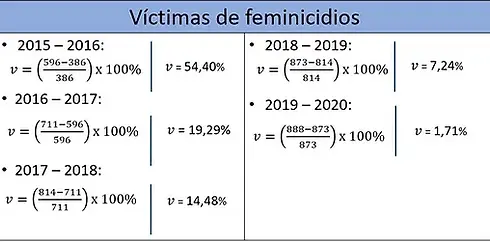 Por otro lado, en los años 2016 y 2017 se vio un aumento de 19,29% de víctimas, en 2017 y 2018 se vio un aumento de 14,48% de víctimas, en 2018 y 2019 se vio un aumento de 7,24% de víctimas de feminicidio.