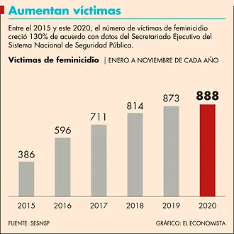 Según los datos proporcionados del gráfico de “Cifras de víctimas de feminicidio” en enero a noviembre desde 2015 hasta 2020.